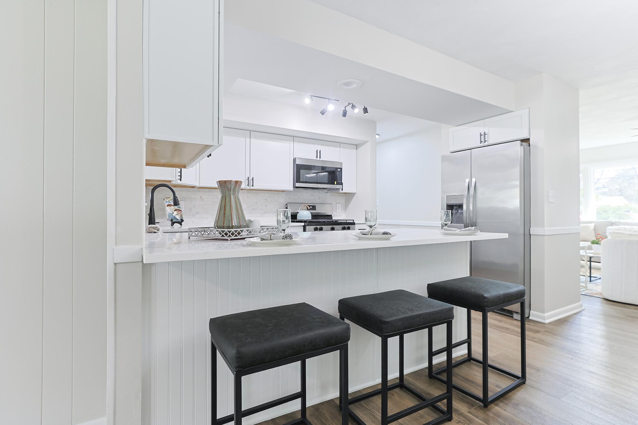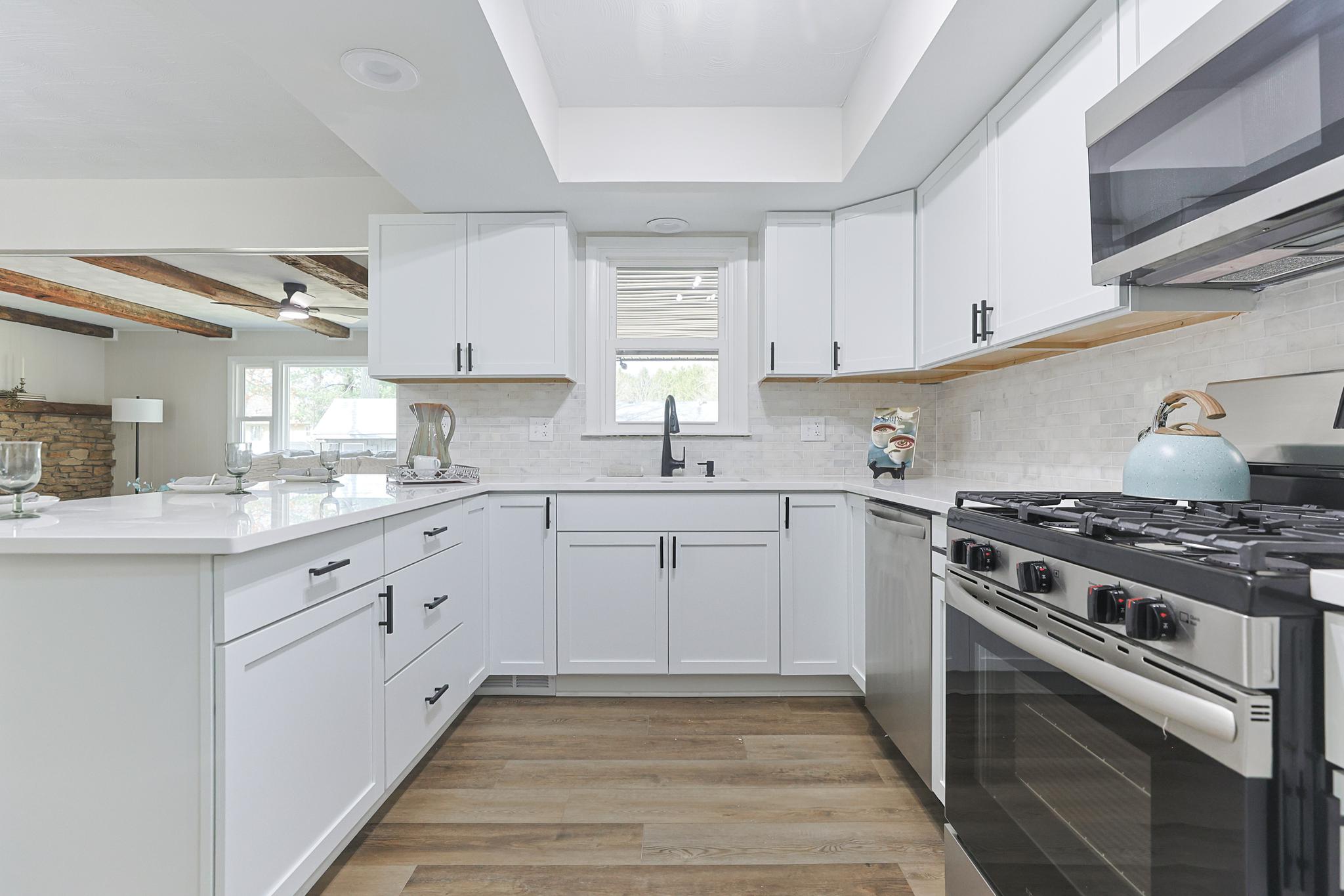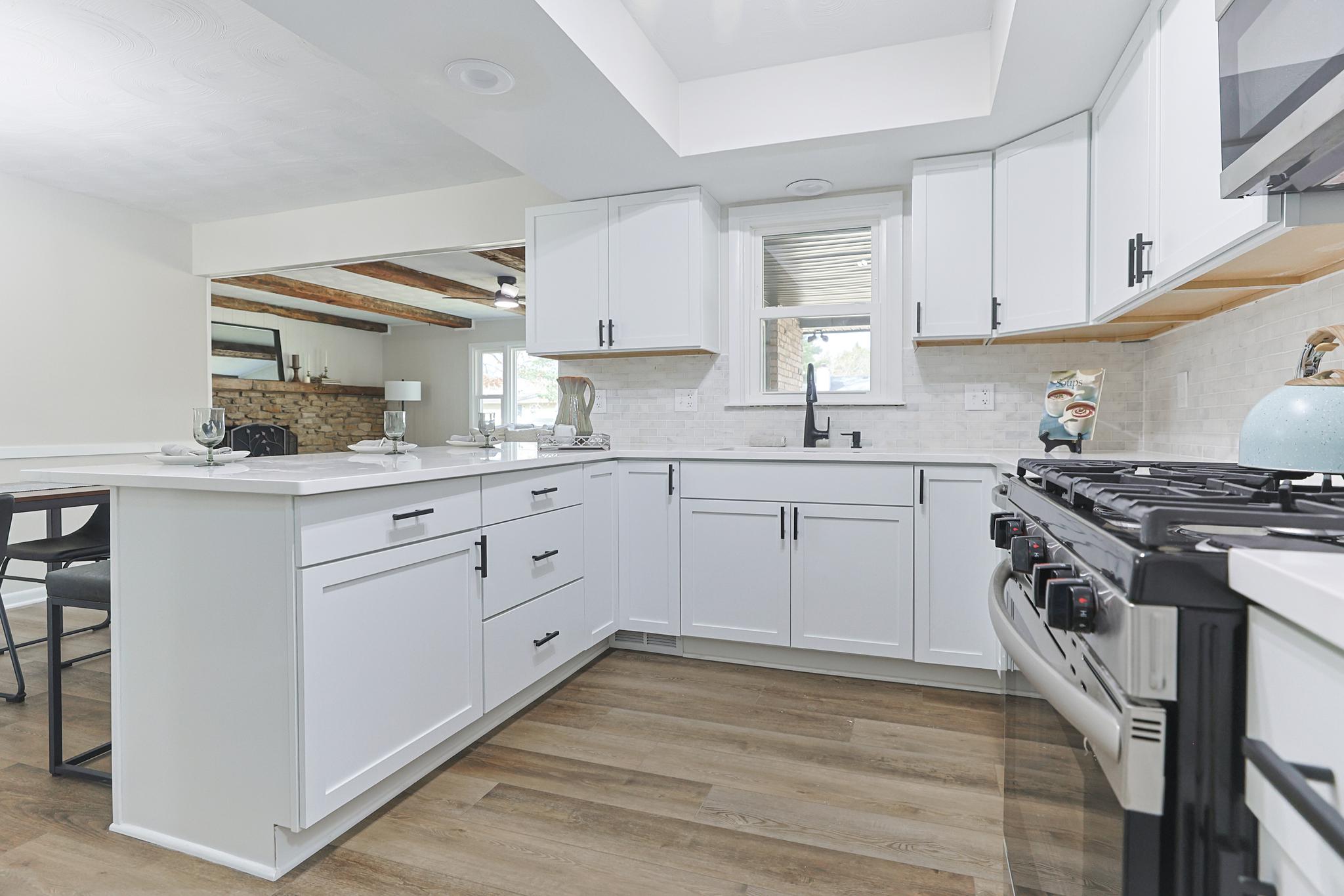 Updated kitchen with quartz countertops, large peninsula, tiled backsplash, and under-cabinet lighting